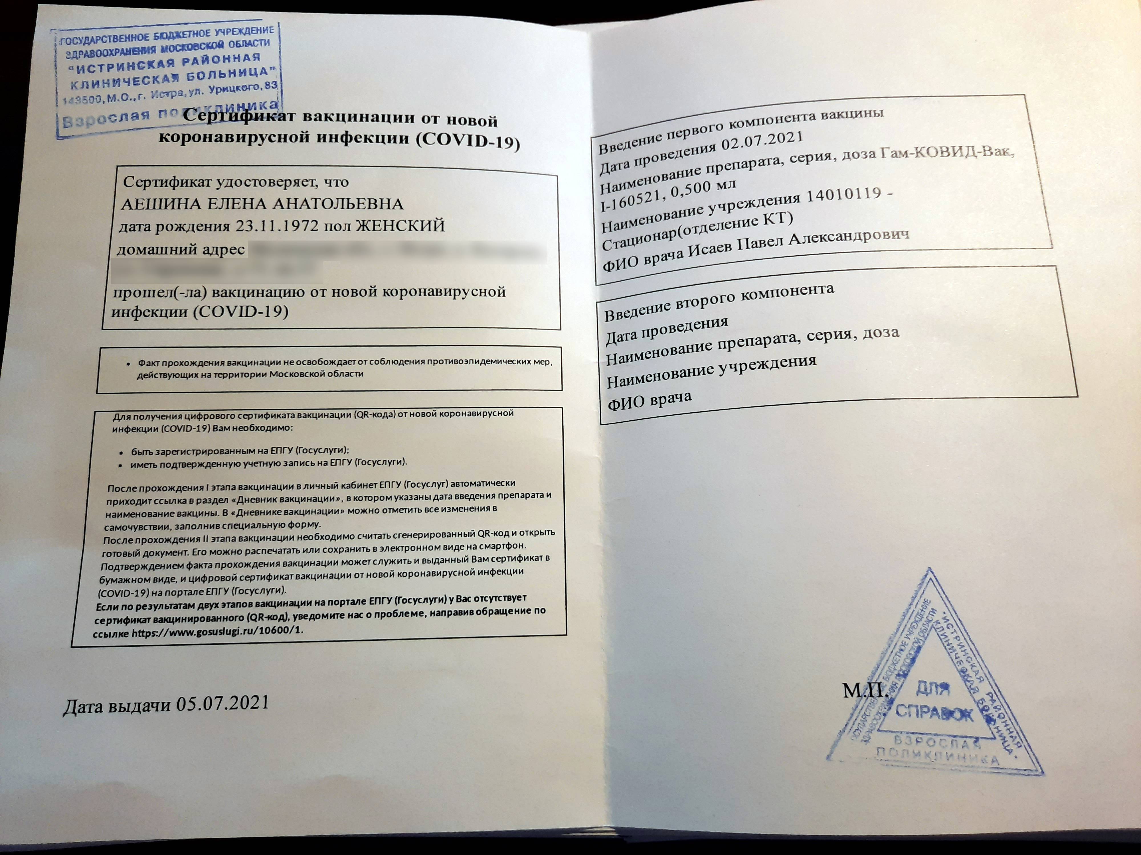 Медсестра внесла мою прививку в компьютер, а затем мне распечатали прививочный сертификат, в котором пока пустует окошко о втором компоненте вакцины.