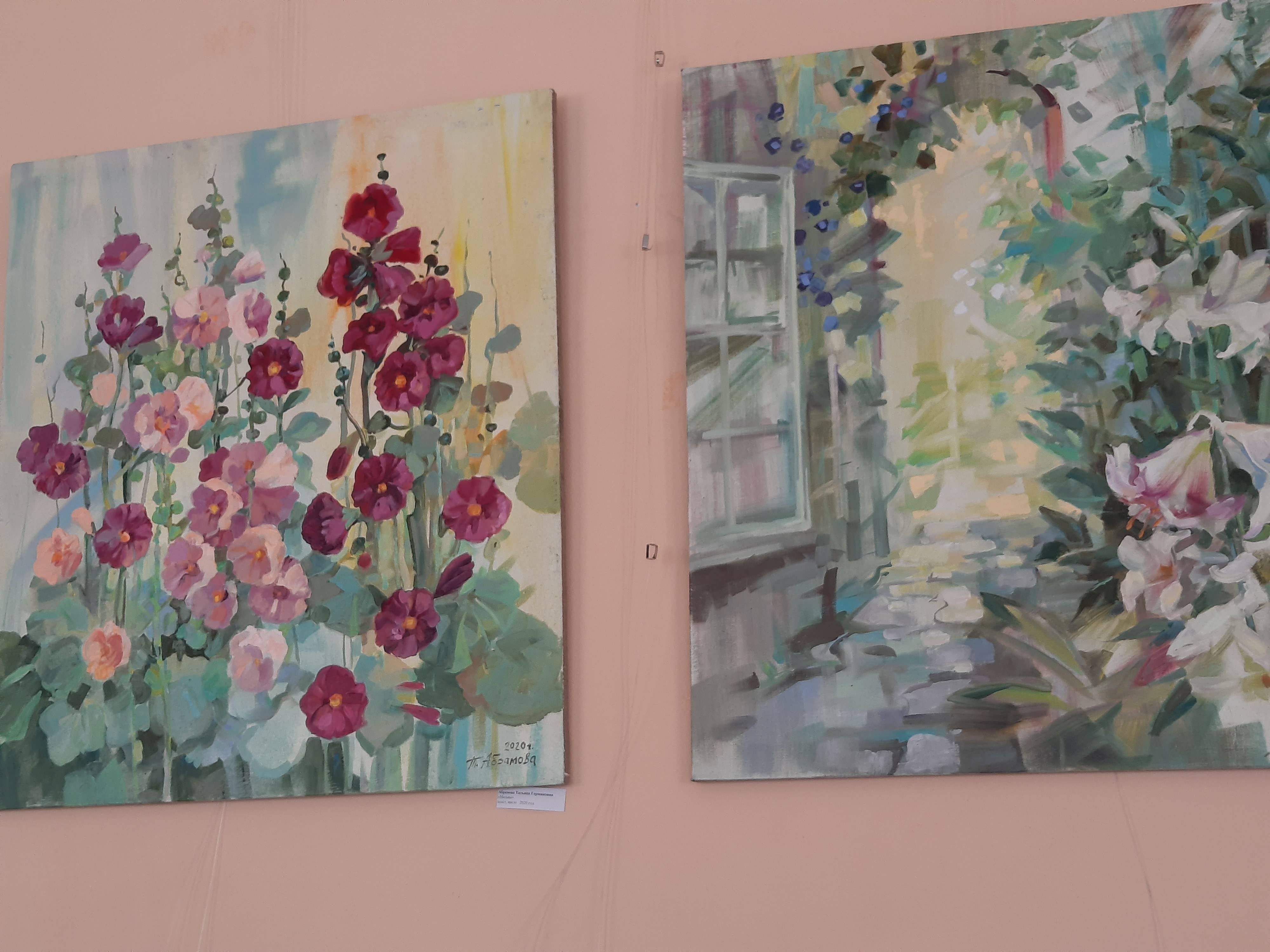 Художница отметила, что зеленый и бирюзовый цвета обычно не свойственны ее работам. «Скорее всего, после очень сложного учебного года, всеобщего карантина и ограничений, хотелось свободы, легкости, радости и единения с природой. Картины писала здесь, в Истре, а множество цветов, потому, что цветы для меня позитивная энергия. Вот, например, обычные мальвы, но это же настоящий праздник лета, яркости, цвета!»