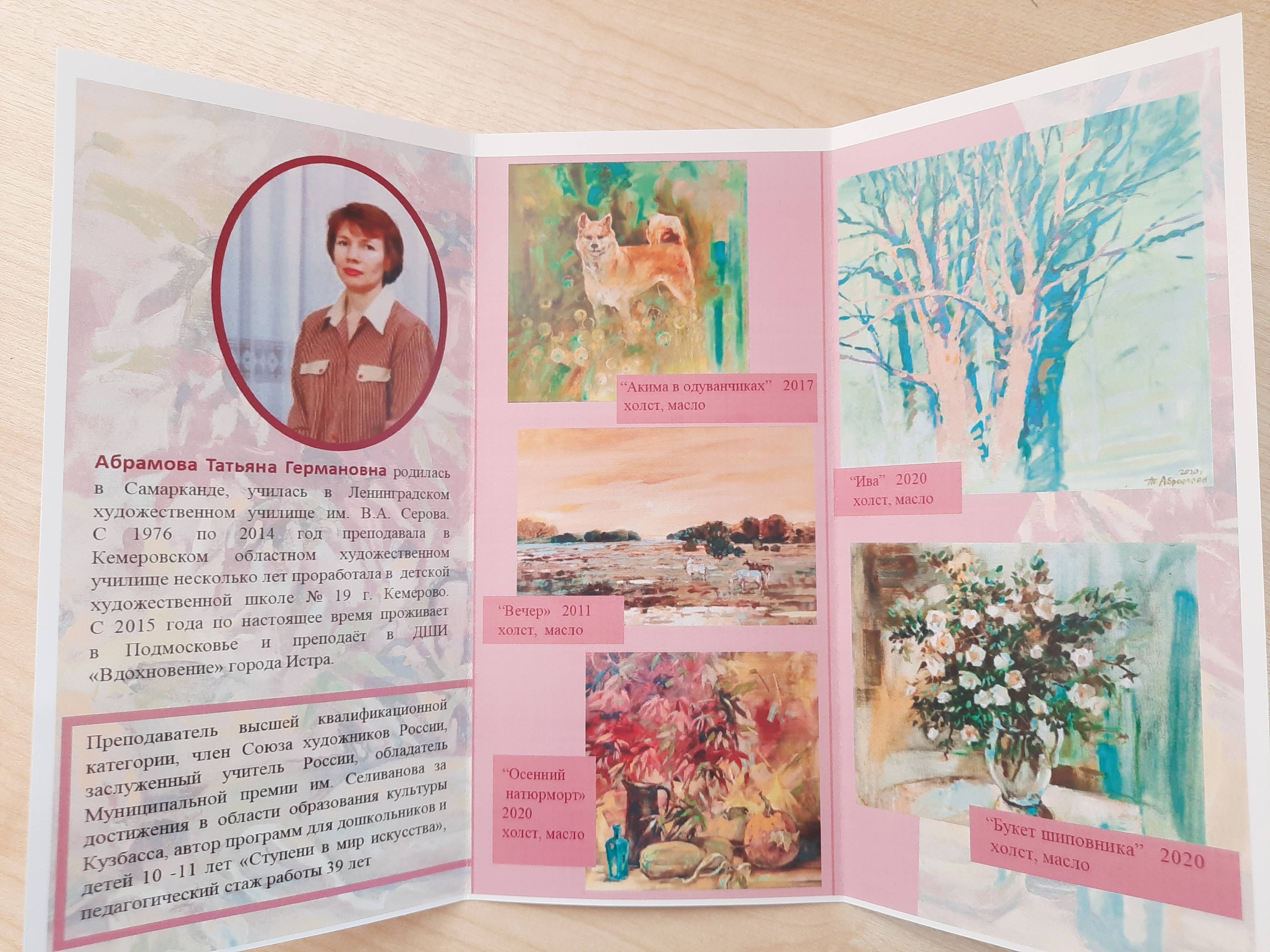 Татьяна Абрамова давно передаёт свое мастерство ученикам школы искусств. В 2020 году, на персональной выставке Татьяны Абрамовой в Истринской центральной библиотеке мы записали с художницей большое интервью, которое и предлагаем Вам для знакомства с Татьяной Абрамовой.