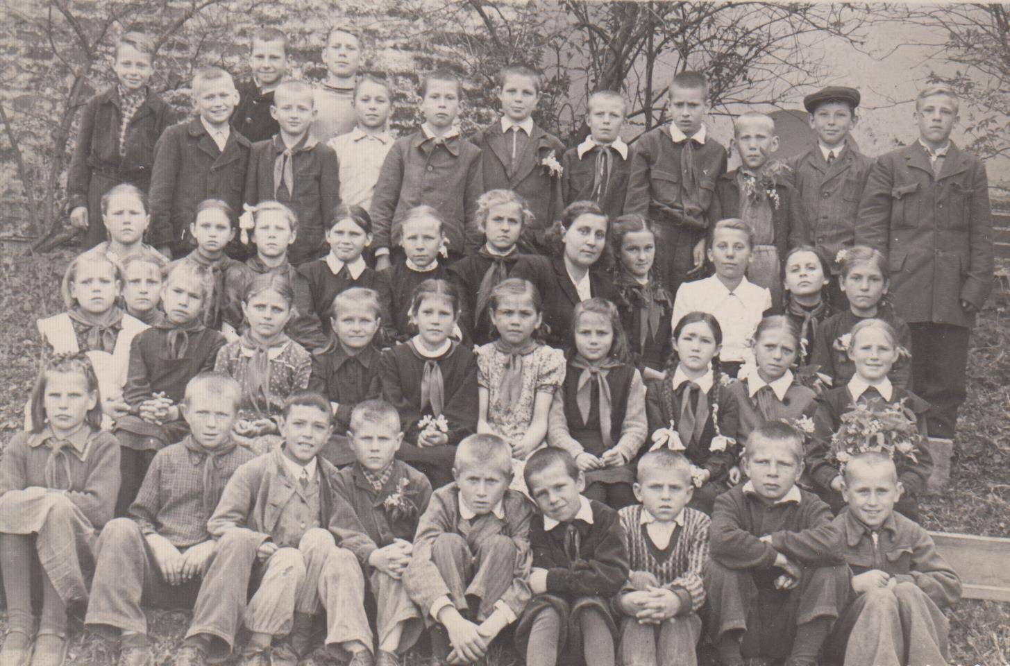 Школа им. Крупской. Классный руководитель Александра Ивановна Воинова. Сирень и черёмуха в руках — фото сделано в конце учебного года. К сожалению, не указано, какой именно класс запечатлён на снимке.