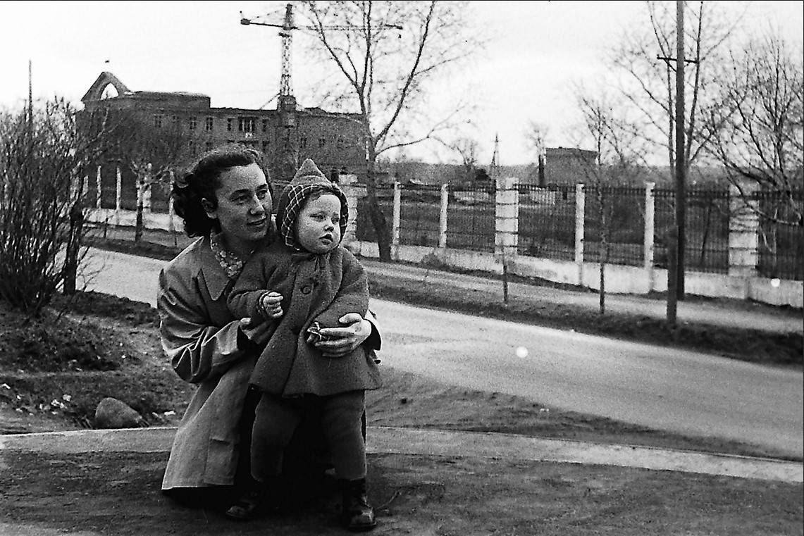 На фотографии Валентина Александровна Алимпиева с дочерью Наташей. Напомним, Владимир Алимпиев — автор многих фото, которые вошли в коллекцию Владимира Рачкова. Посмотрите, на заднем плане идёт строительство Дома культуры. Уже огорожена территория будущего городского парка. Что интересно — дизайн забора тот же, что и теперь.