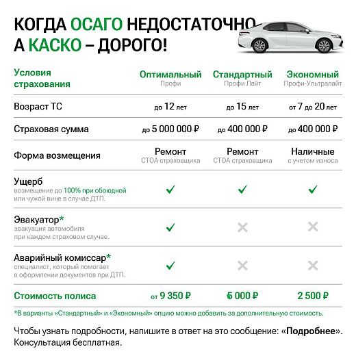 Каско-Профи. Страховая защита для опытных водителей - наших клиентов по ОСАГО. Оптимальное дополнение к полису ОСАГО. Отсутствие ОСАГО у виновника ДТП не влияет на выплату. Консультации бесплатно. Доступные цены. Быстрое оформление. Безопасная оплата. Позвоните сейчас!