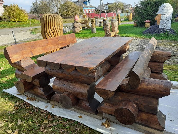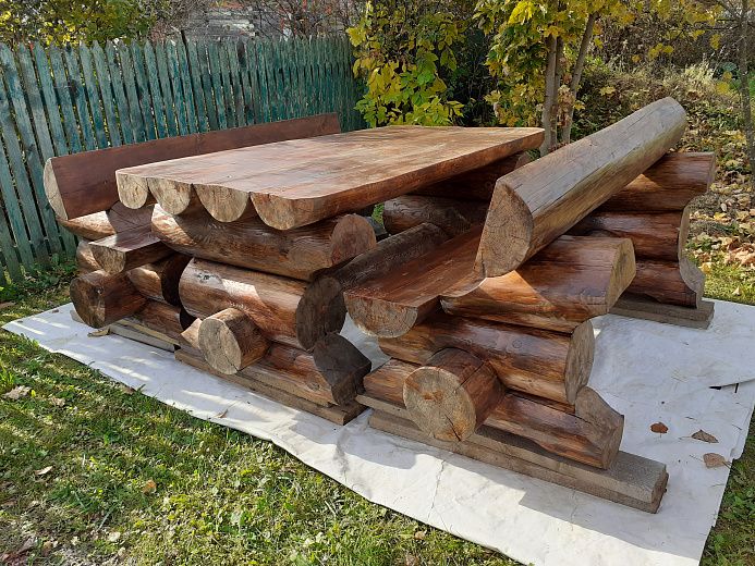 Мебель из бревна обработана грунтом и маслом БИОФА.