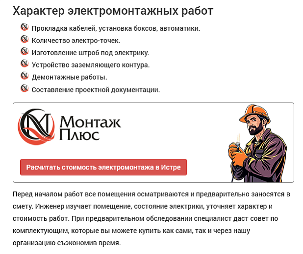 Все виды электромонтажных работ и многое другое на сайте ООО "Монтаж плюс". Следуйте ссылке: https://servisplus.su/uslugi/elektrosnabzhenie