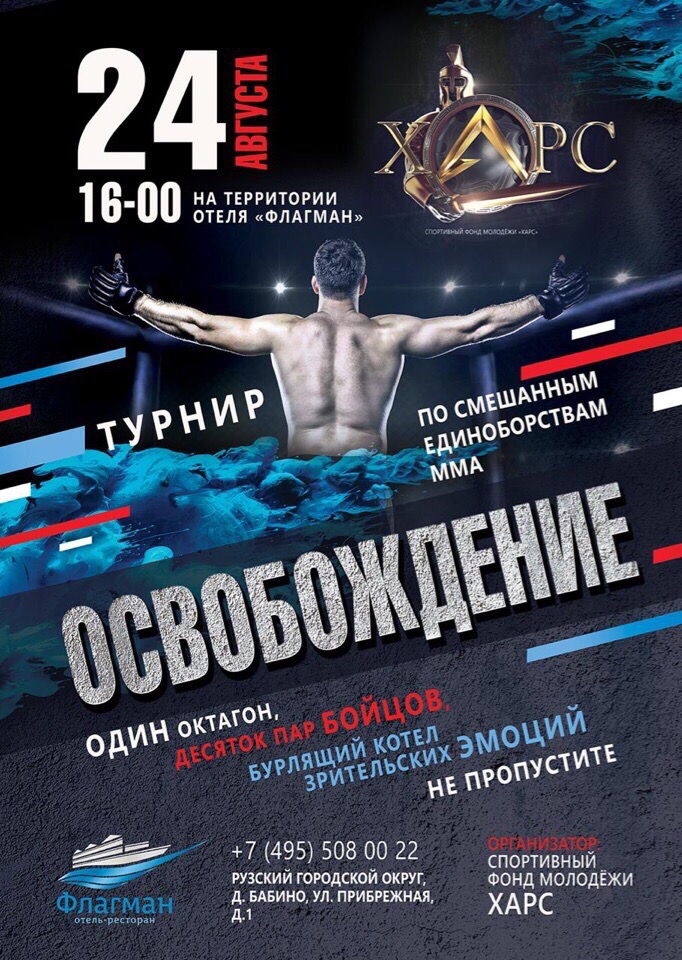 24 августа в 16:00 на территории отеля «Флагман» (г. Руза), будет представлено незабываемое шоу. Десять пар бойцов смешанных единоборств жаждут помериться силой, ловкость, выносливостью — продемонстрировать все свои навыки и способности. В турнире примут участие спортсмены из Истры, Москвы, Зеленограда, Ярославля и Старого Оскола.