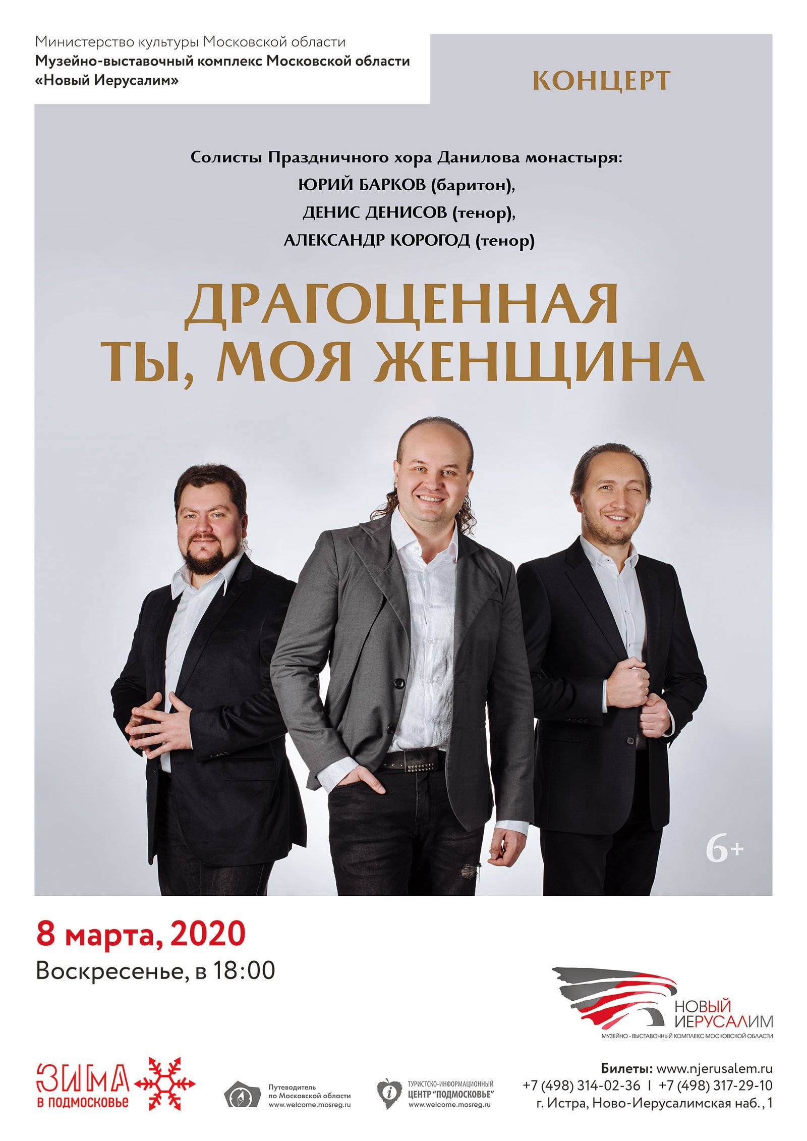 На сцене МВК «Новый Иерусалим» выступят солисты Праздничного хора Данилова монастыря: Юрий Барков (баритон), Денис Денисов (тенор) и Александр Корогод (тенор) и посвятят свой концерт прекрасным дамам. В премьерной программе прозвучат известные песни: «Очарована-околдована», «Мама», «Зорька алая», «Петр и Февронья», «Платье», «Скажите, девушки, подружке вашей» и многие другие.