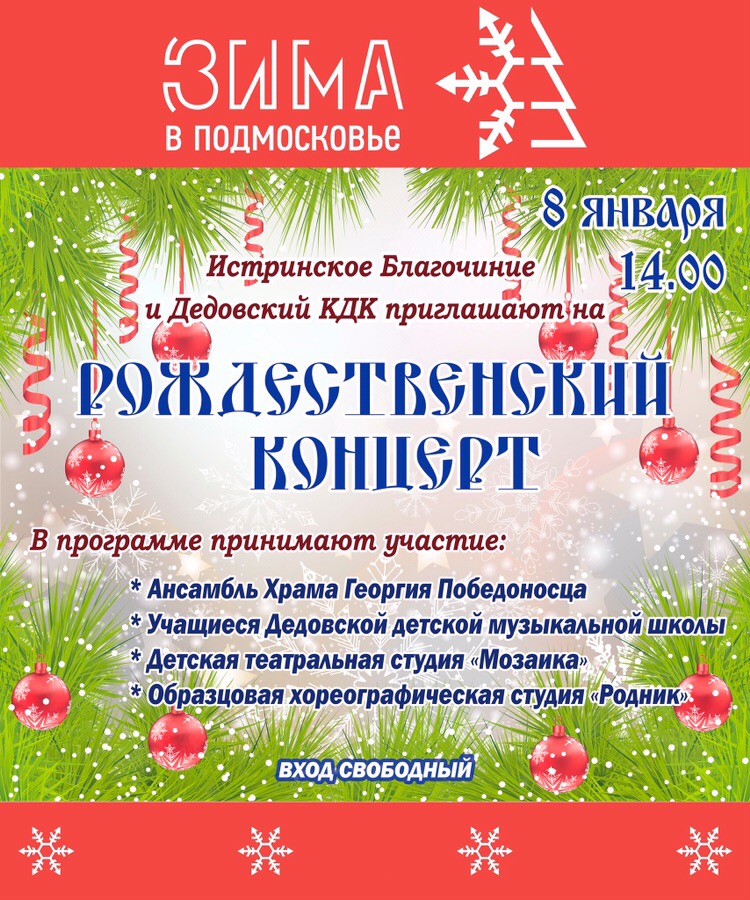 Истринское благочиние и МУК «Дедовский КДК» приглашают на Рождественский концерт, который пройдёт 8 января в 14:00