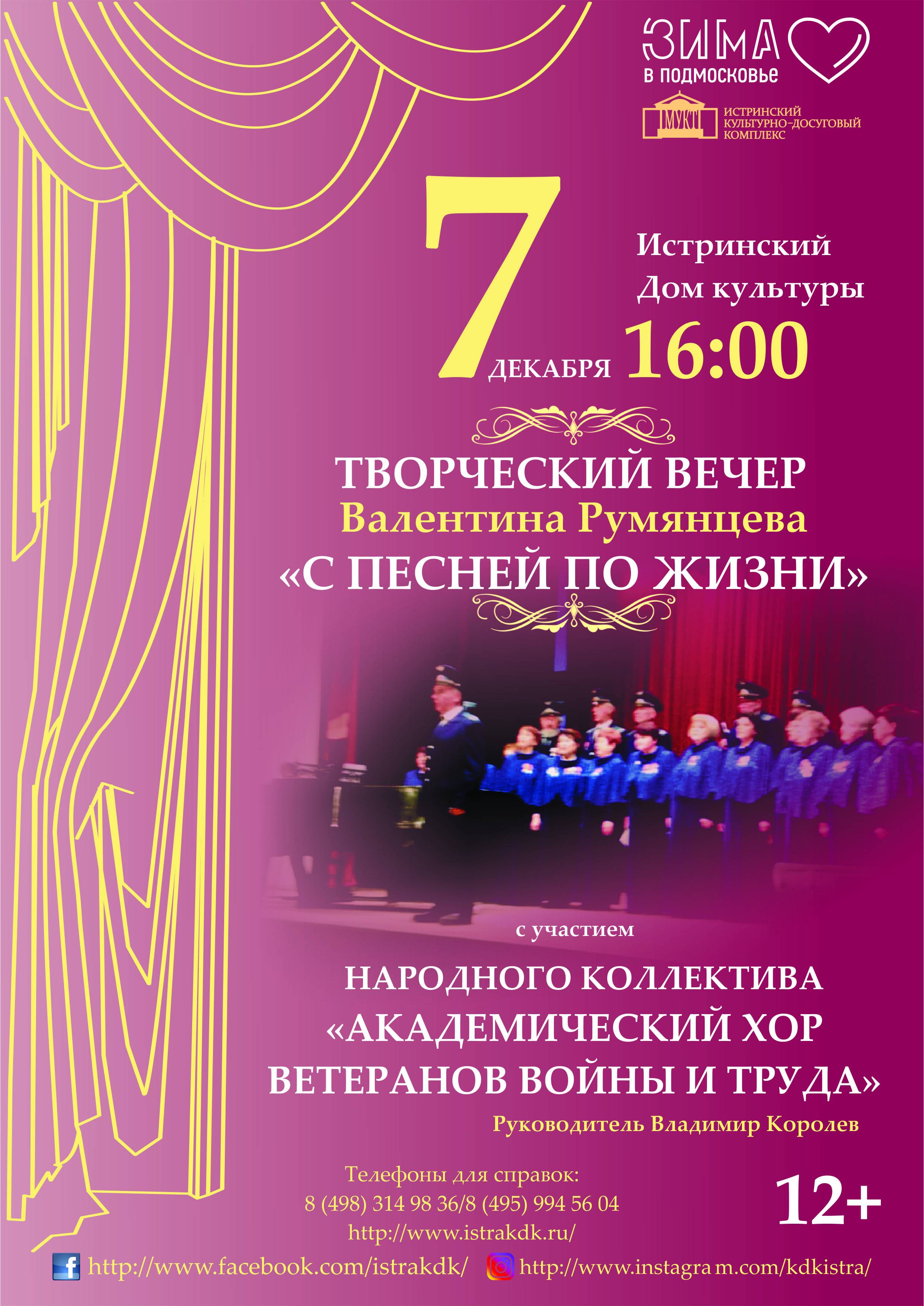 7 декабря в Истринском Доме культуры пройдёт творческий вечер Валентина Румянцева с участием народного коллектива Хора ветеранов.