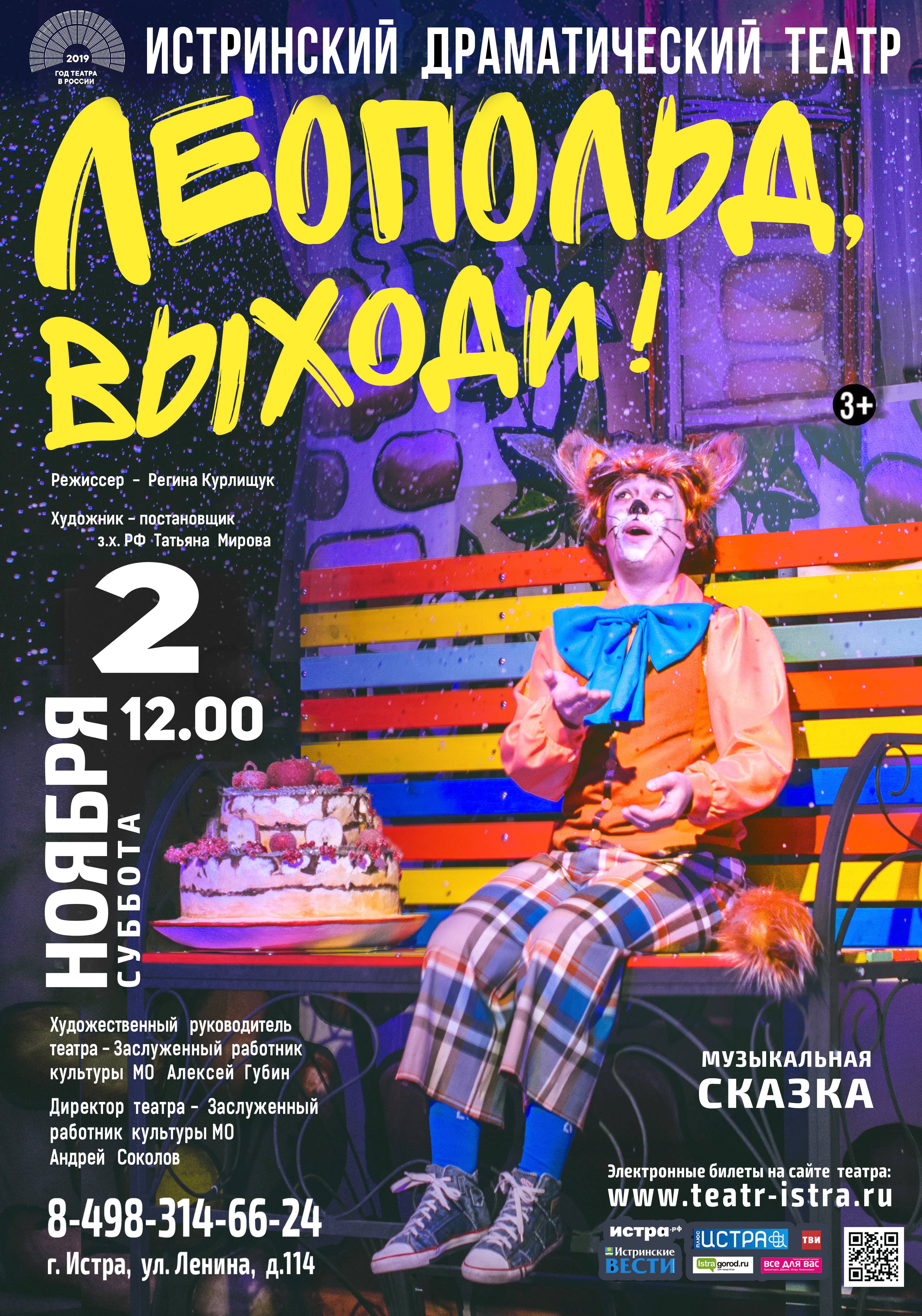 Приятный во всех отношениях, очаровательный кот Леопольд решил отпраздновать свой День Рождения. Каждый по-своему, поздравить именинника торопится Пёс и его непоседливые соседи – маленькие мышата Серый и Белый. Разыскивая сильнодействующее волшебное лекарство «Озверин», коварные грызуны ежеминутно строят разнообразные козни своему добродушному соседу. Каких подарков ждать имениннику и как Леопольд проучит коварных хитрецов, вы узнаете в нашем спектакле. Яркая и красочная история с веселыми песенками в очередной раз докажет юным зрителям, что «Добрым жить на белом свете веселей»!