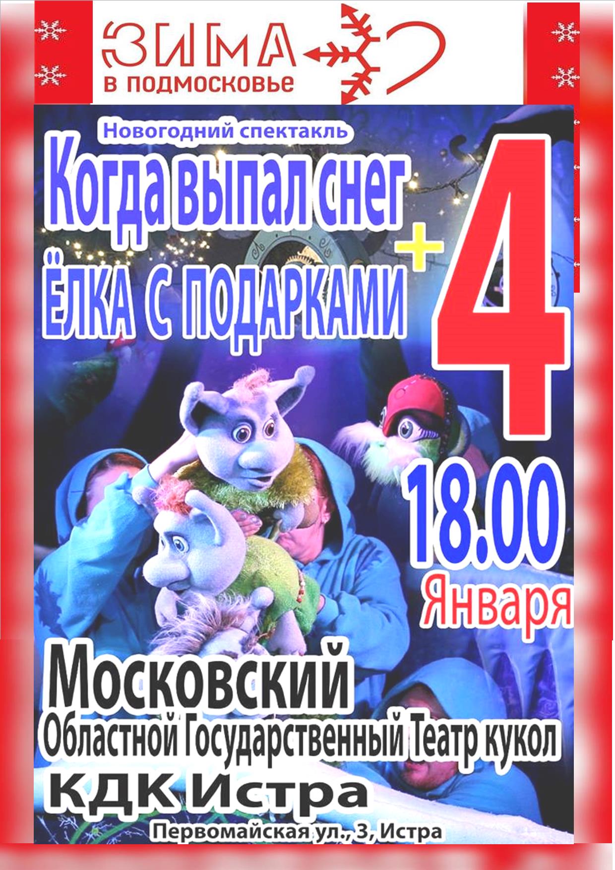 ДК города Истры приглашает 4 января на Ёлку и спектакль Московского областного государственного театра кукол.