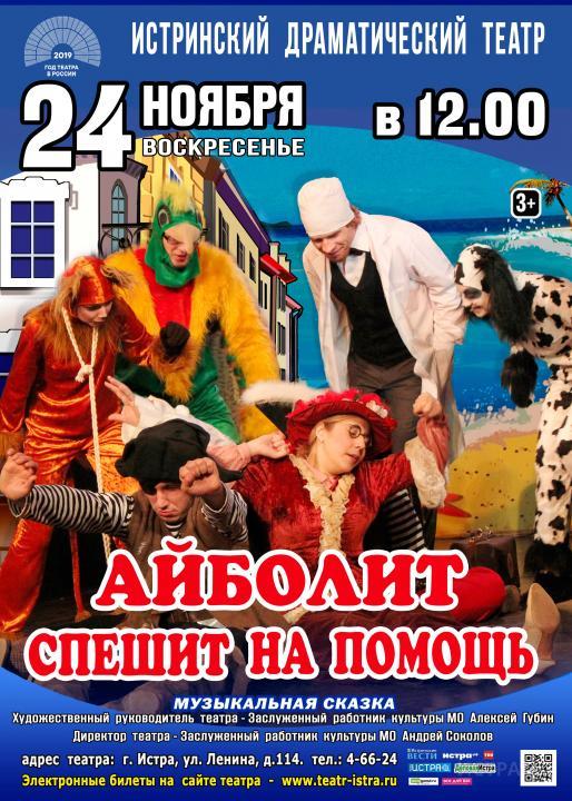 Сценическая версия “Айболита” появилась в Истринском драматическом театре в 2013 году и подарила новую жизнь героям любимой истории. Благодаря современному театральному языку, яркой задорной музыке, прекрасному актерскому ансамблю и, конечно же, добрым и забавным героям эта музыкальная сказка интересна самому широкому кругу зрителей.
