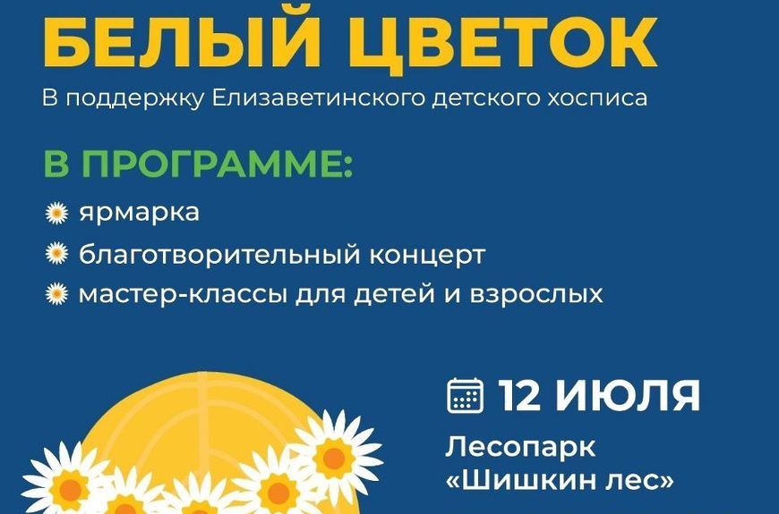 Благотворительный «Белый цветок» в поддержку Елизаветинского детского хосписа состоится 12 июля, в пятницу у главной сцены лесопарка «Шишкин лес». Начало в 14:00.