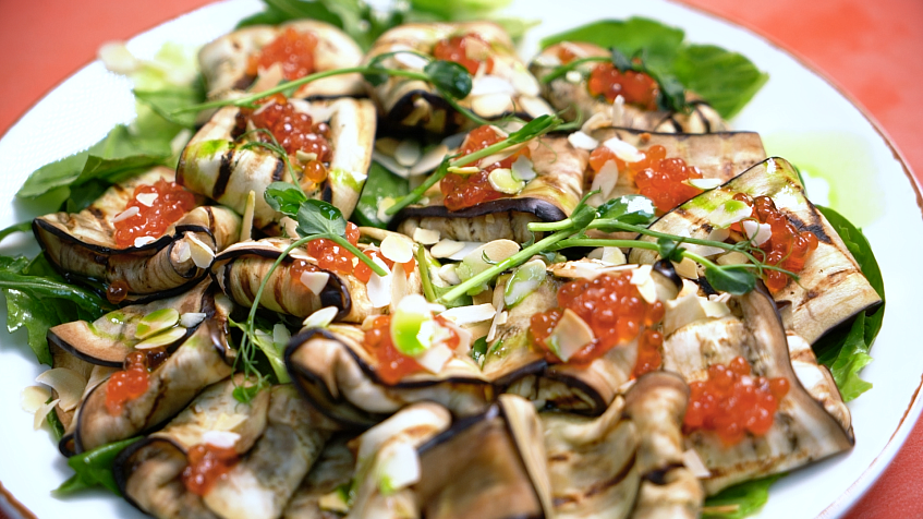 В специальном выпуске мы вместе с шеф-поваром «НеШабли» приготовили баклажаны с творожным сыром и вялеными томатами.