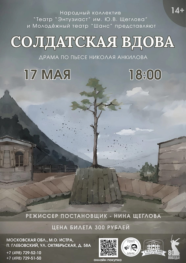 17 мая, в субботу, Народный коллектив Театра «Энтузиаст» им. Юрия Васильевича Щеглова и молодёжный театр «Шанс» представят драму «Солдатская вдова» по пьесе Николая Анкилова.