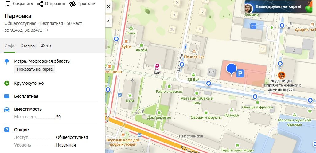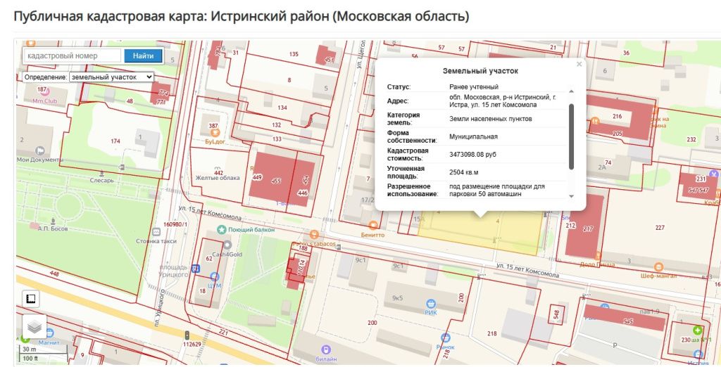 Согласно публичной кадастровой карте, земельный участок является муниципальным. Здесь могут разместиться одновременно 50 автомашин.
