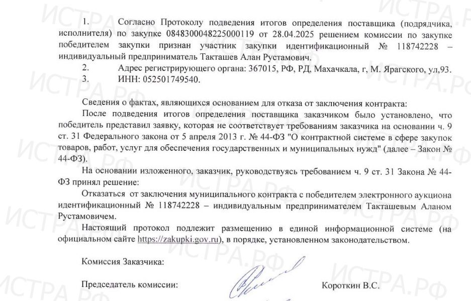 На сегодняшний день стало известно, что аукцион на частичную компенсацию транспортных расходов организаций и индивидуальных предпринимателей за доставку продовольственных и промышленных товаров в сельские населённые пункты муниципального округа Истра (цена вопроса — 11,7 миллионов рублей) выиграл индивидуальный предприниматель Такташев Алан Рустамович с адресом регистрации в Республике Дагестан, Махачкала. А следом был опубликован протокол отказа от заключения муниципального контракта с победителем открытого конкурса по причине выявления заявки, не соответствующей требованиям заказчика.