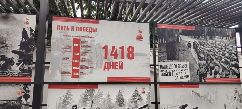 Возле площади Урицкого, там, где была раньше Стена памяти, а ныне размещены фотографии об истории города, к празднику разместили подборку фактов и фото о Великой Отечественной.