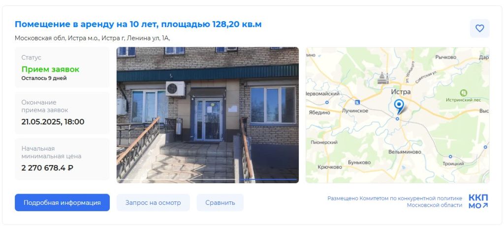 Помещение площадью 128, 2 квадратных метра на улице Ленина, 1а, где раньше располагался центральный офис банка в Истре, находится в собственности муниципального образования «Муниципальный округ Истра Московской области». Организатором аукциона является Комитет по конкурентной политике Московской области.