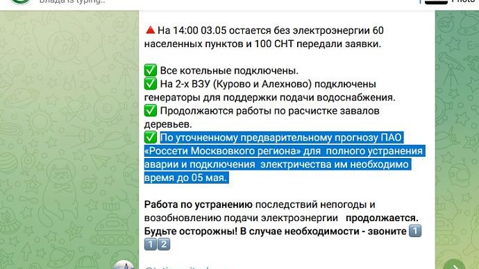 По уточнённому предварительному прогнозу ПАО «Россети Московского региона», для полного устранения аварии и подключения электричества им необходимо время до 5 мая. Стоит отметить, что спустя время данная строчка исчезла из официального сообщения от главы округа.