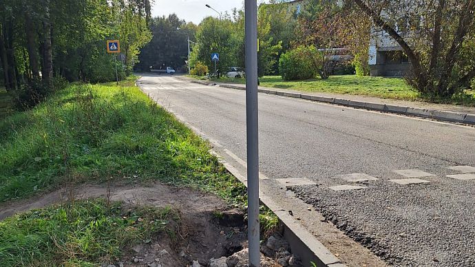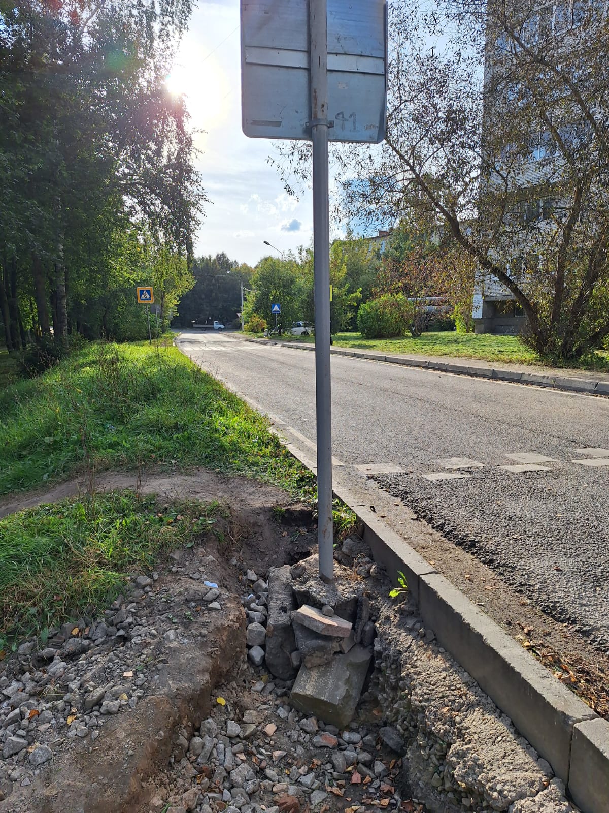 Спустя неделю рабочие подсыпали склон у дороги землёй вперемешку с песком. Чуда не произошло. Не прошло и двух месяцев — и на том же самом месте зияют огромные дыры. На этот раз рухнула конструкция дорожного знака, лишь по счастливой случайности не задев ребёнка.