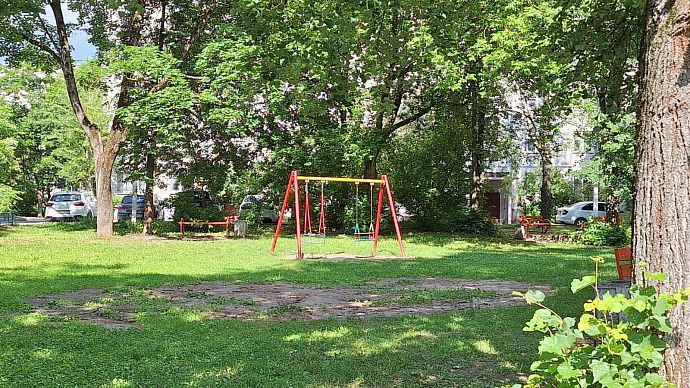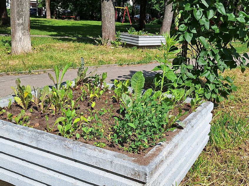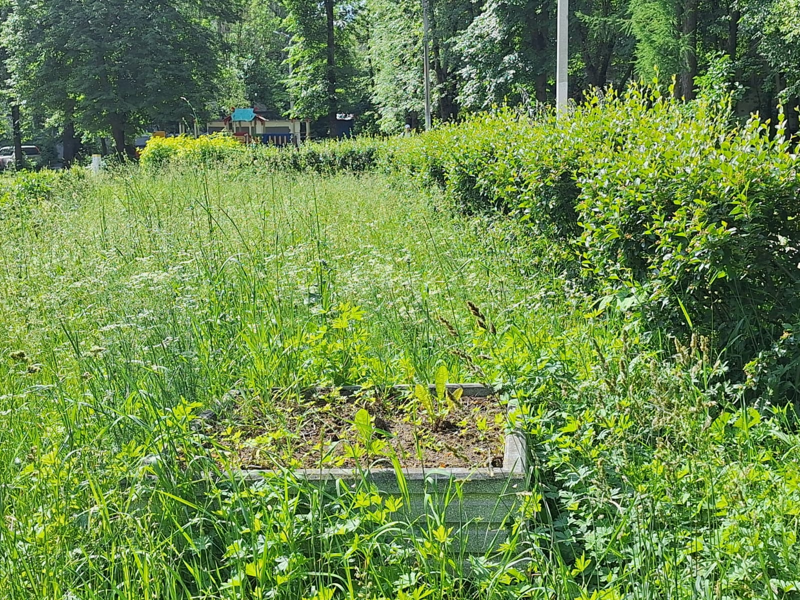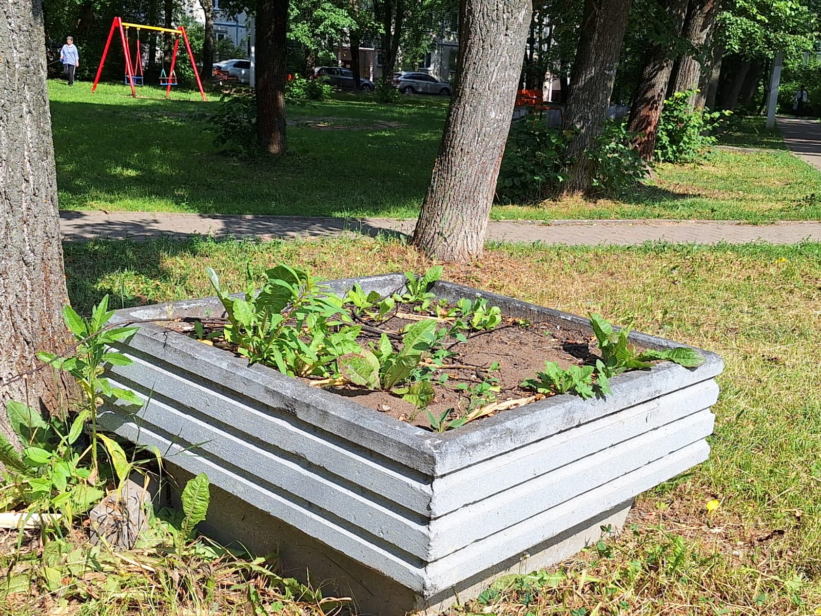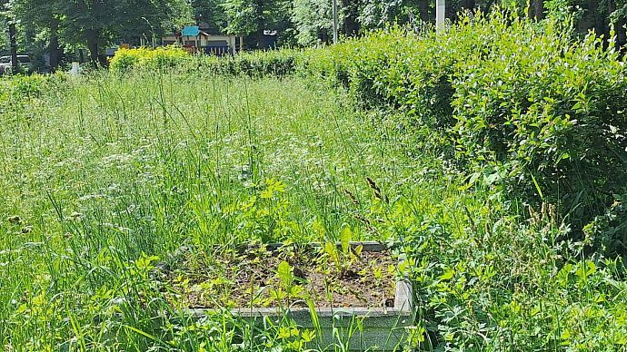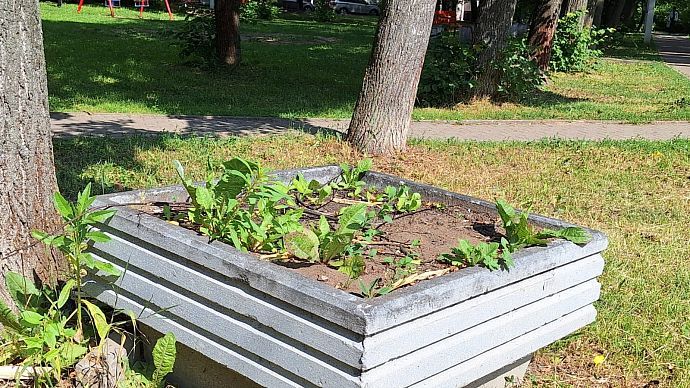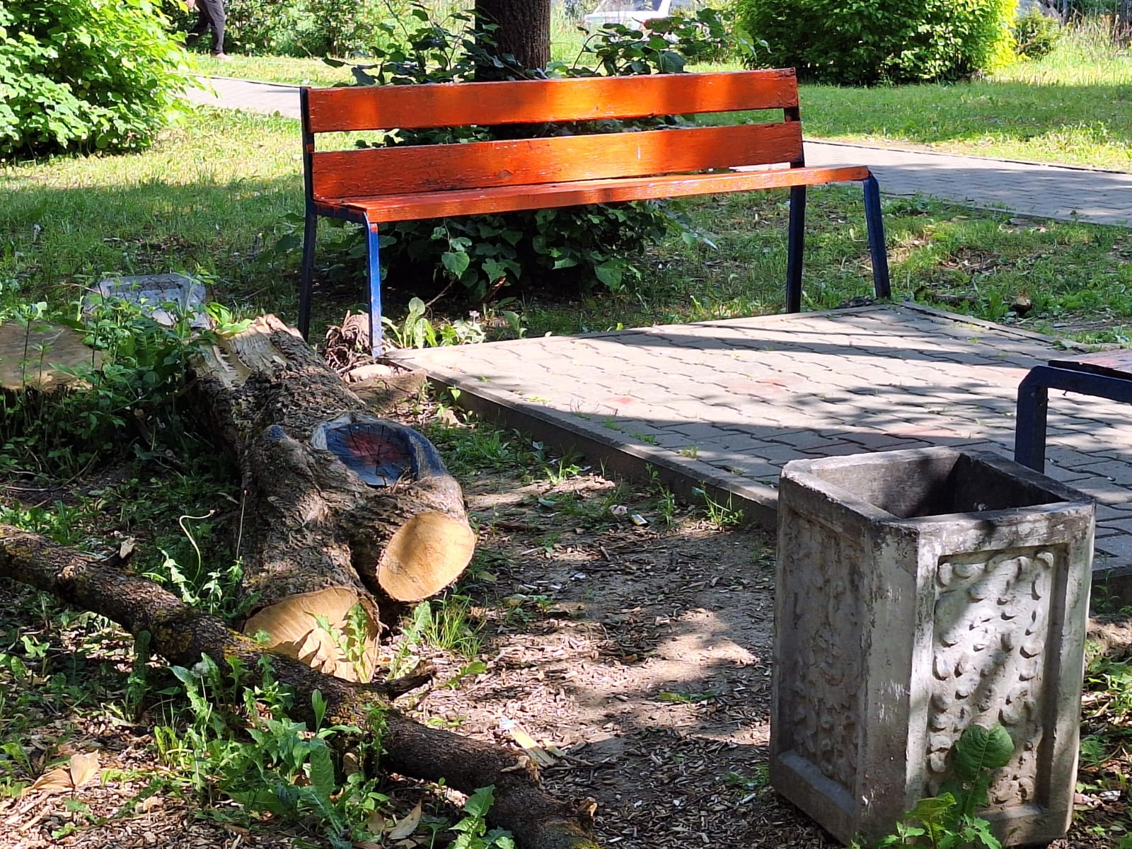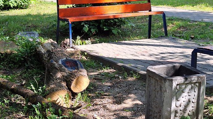 При этом в сквере на улице Босова все клумбы стоят серые и унылые. Здесь до сих пор не убраны распиленные деревья, поваленные майским снегопадом. На месте демонтированный детской площадки зияет пустырь.