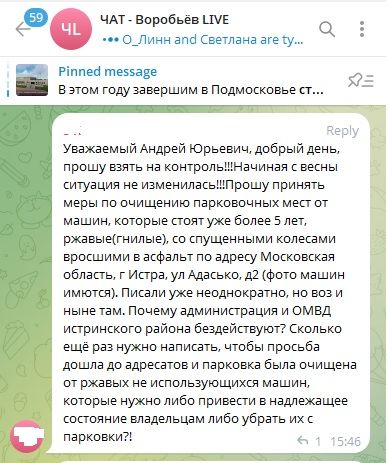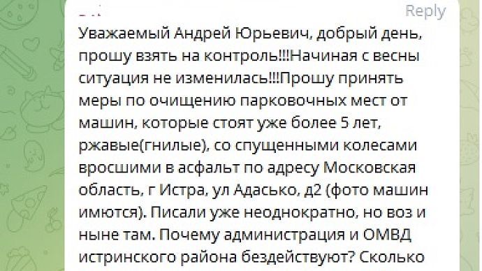 В частности, про автохлам на улице Адасько писали уже неоднократно, но воз и ныне там. «Почему администрация и ОМВД Истринского района бездействуют? Сколько ещё раз нужно написать, чтобы просьба дошла до адресатов и парковка была очищена от ржавых не использующихся машин, которые нужно либо привести в надлежащее состояние владельцам, либо убрать их с парковки?»