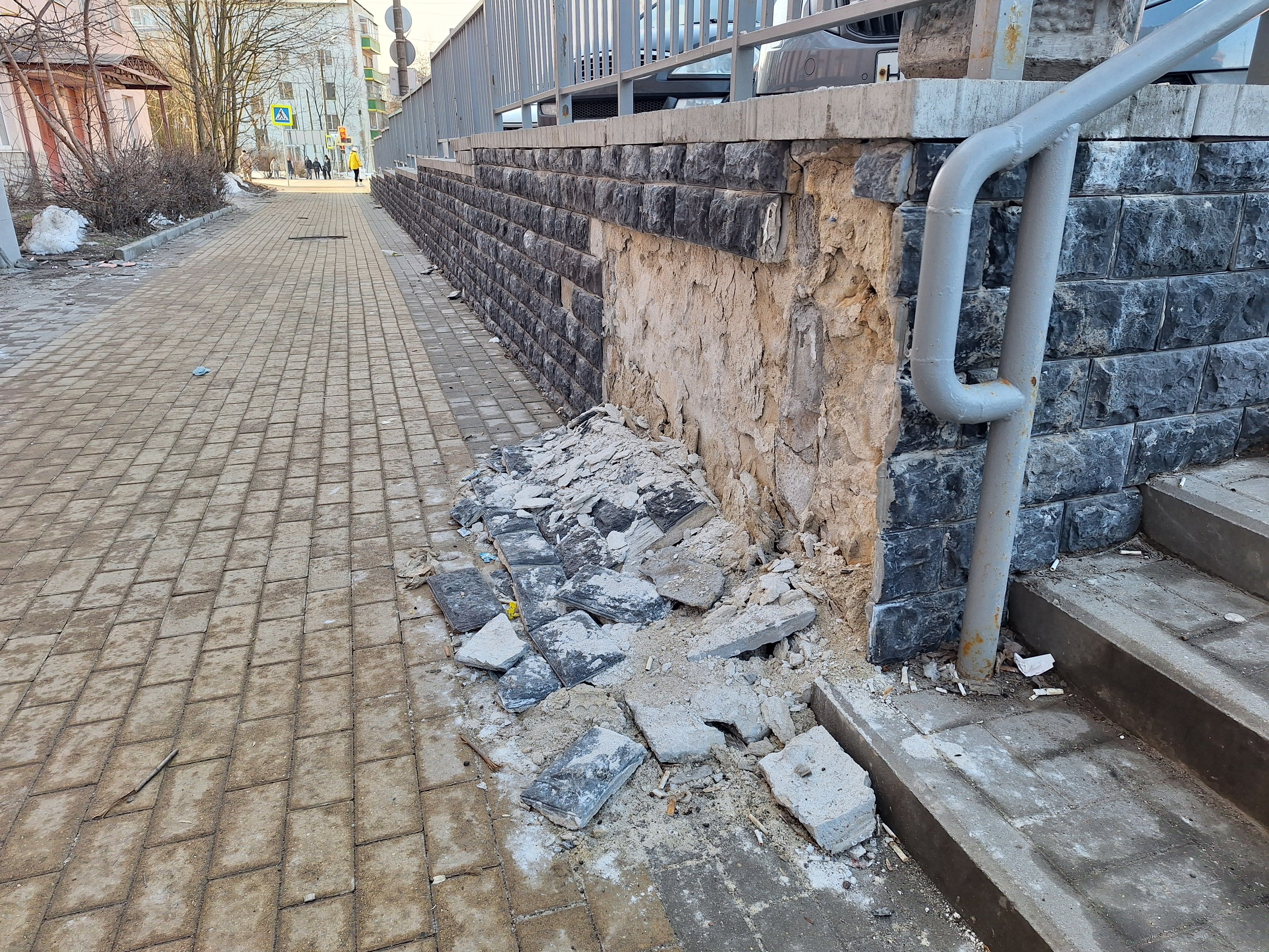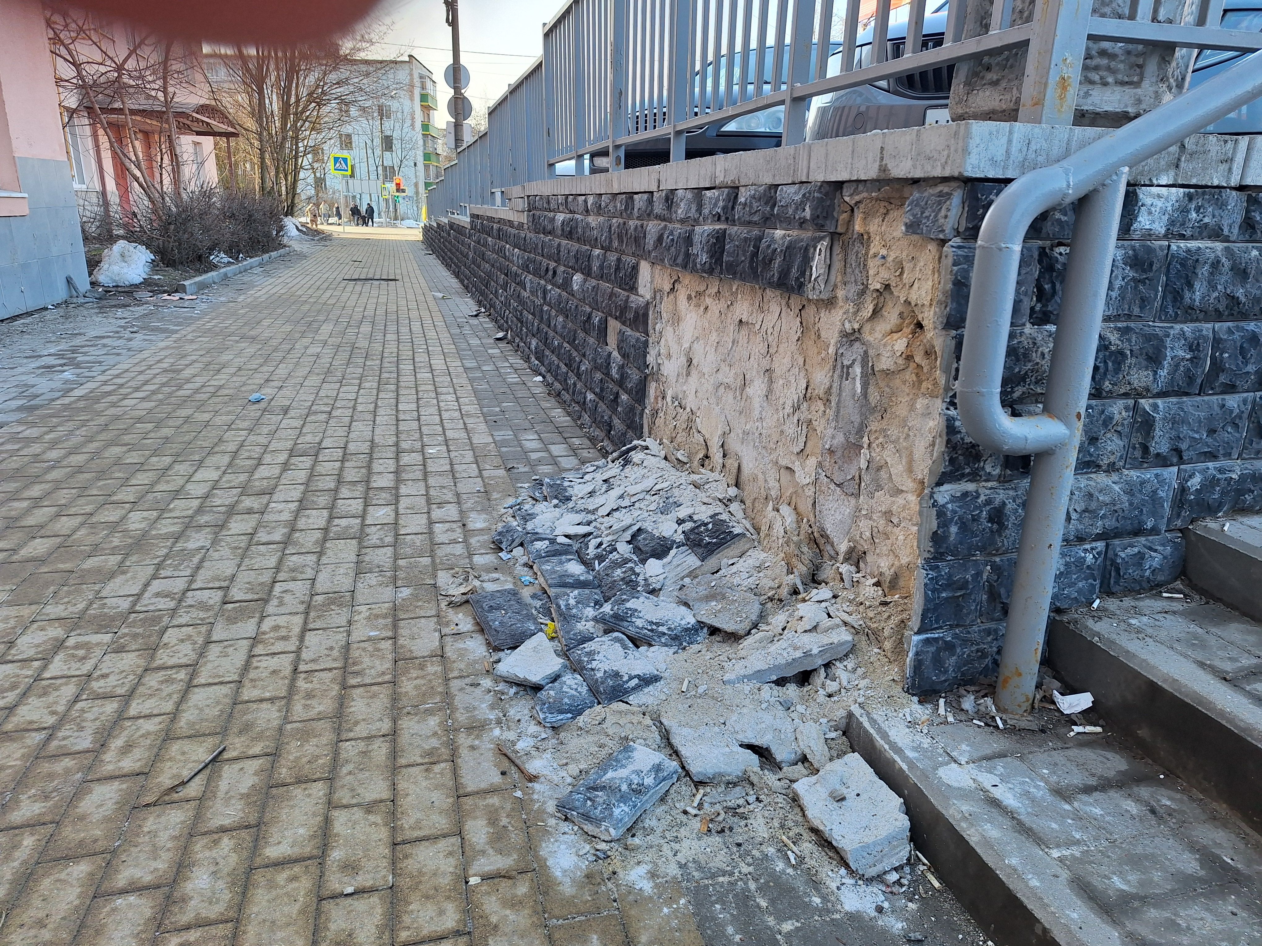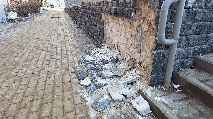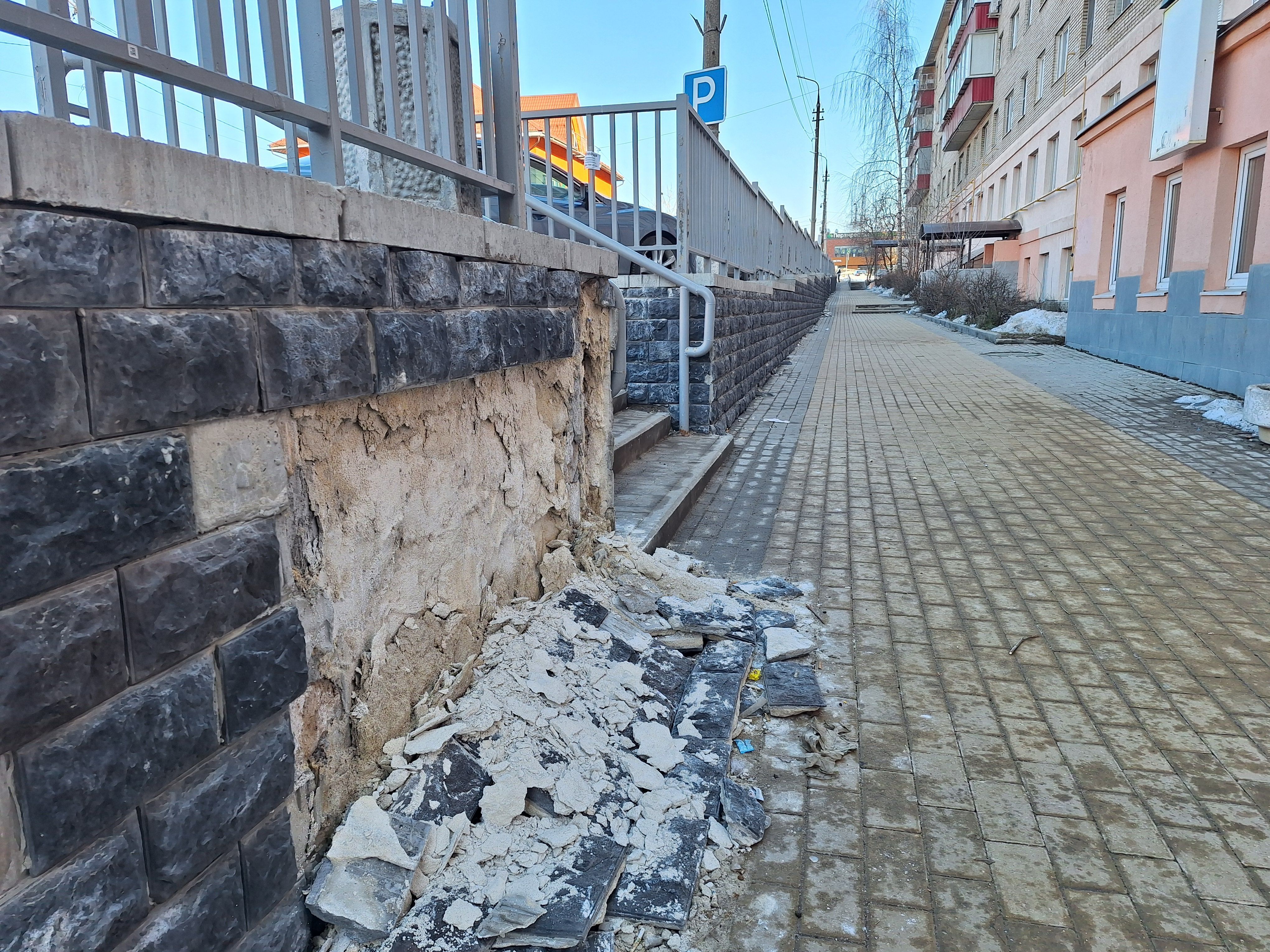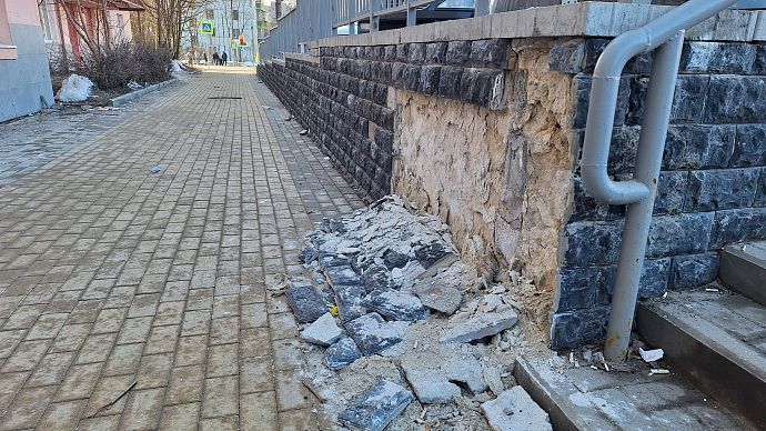 На территории отремонтировали ступени на спусках к поликлинике. Восстановили и выложили декоративной облицовочной плиткой подпорную стену у проезжей части дороги. Однако куски фасада начали отваливаться уже в январе 2025 года.