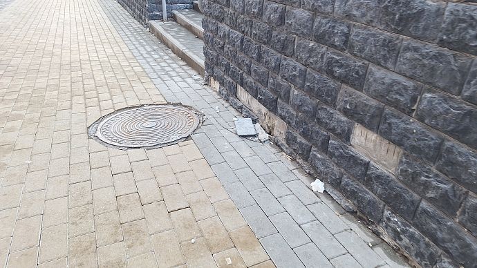 Сегодня здесь, на улице Шнырёва, картина открывается удручающая. Плитка отвалилась кусками практически по всему участку пешеходной зоны. Факт некачественно выполненных работ налицо.