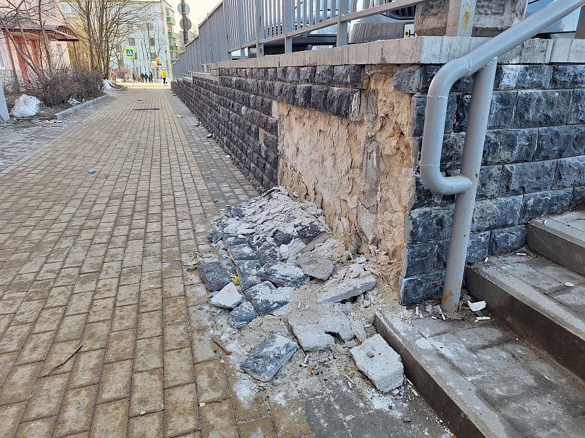 На благоустроенной территории не только отваливается плитка, наспех приделанная в зимний период, — ржавчиной покрывается и новое ограждение. Мы писали об этом весной 2025 года, писали об аналогичной ситуации уже и в текущем, 2026 году.