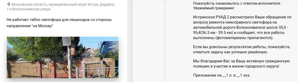 После жалоб горожан Истринское РУАД 2 отчиталось о ремонте неисправного светофора на автомобильной дороге Волоколамское шоссе 35,5 - 95,4(36.3 км - 39.5 км).
