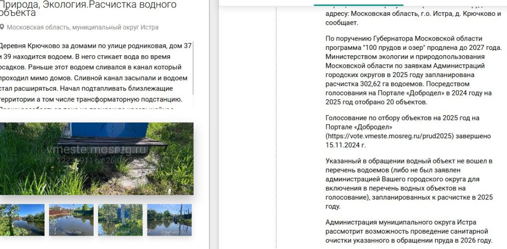 В результате вместо решения проблемы жители получили отписку о том, что водоём не вошёл в программу «100 прудов» и его очистка не запланирована.