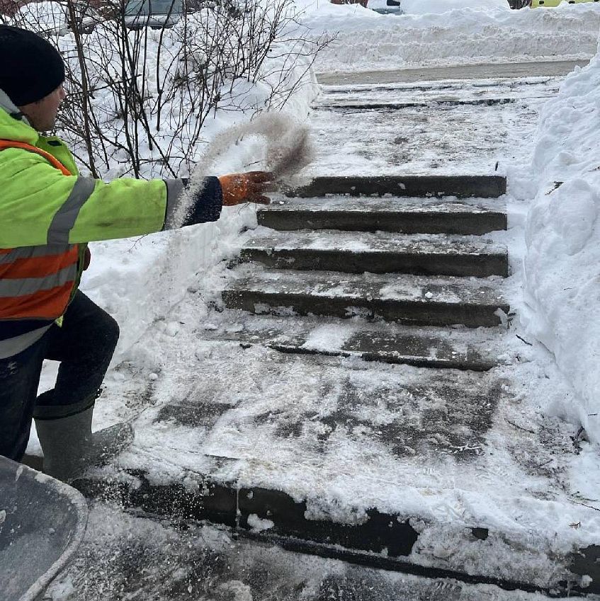 По словам очевидцев, рабочие занимаются расчисткой лестниц от снега, а дорожники сводят на нет результаты их труда.