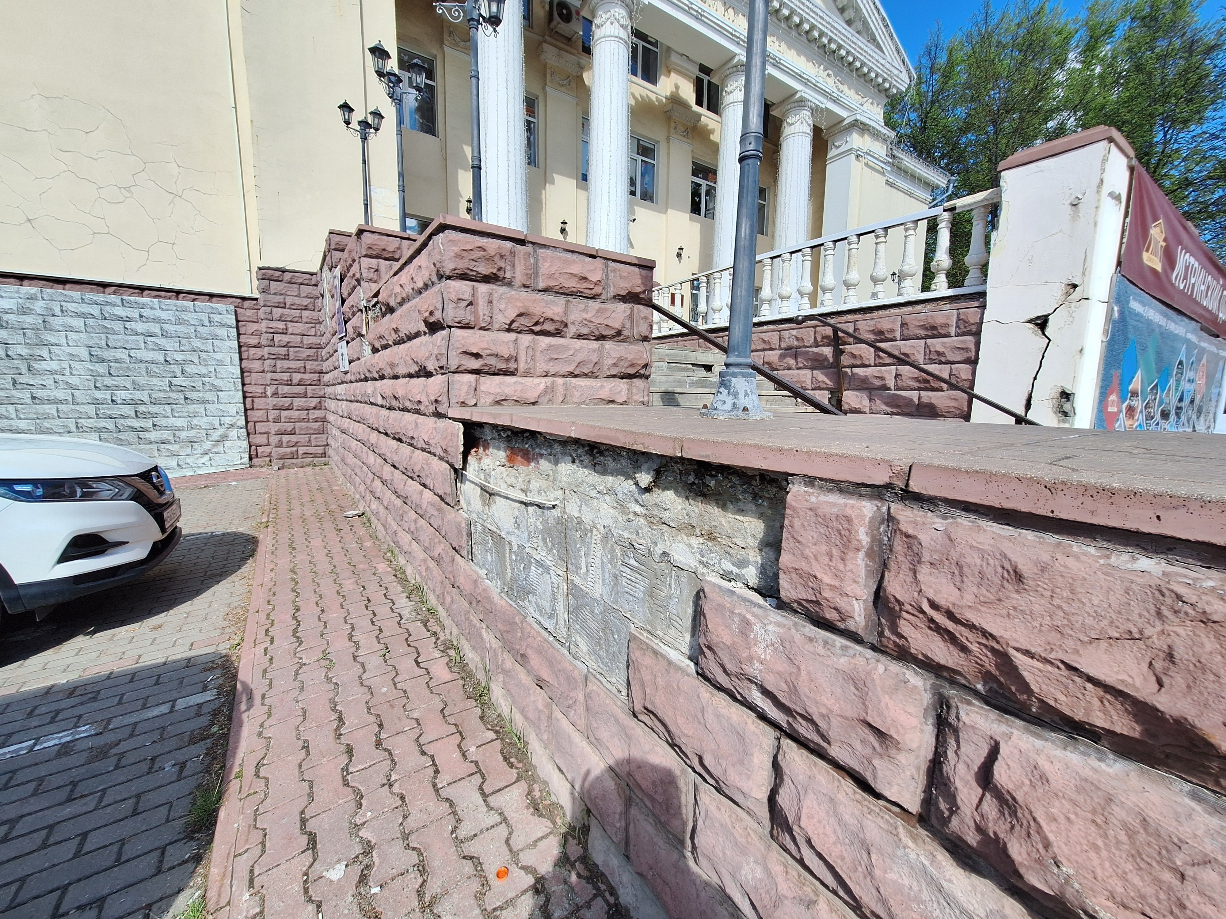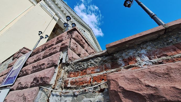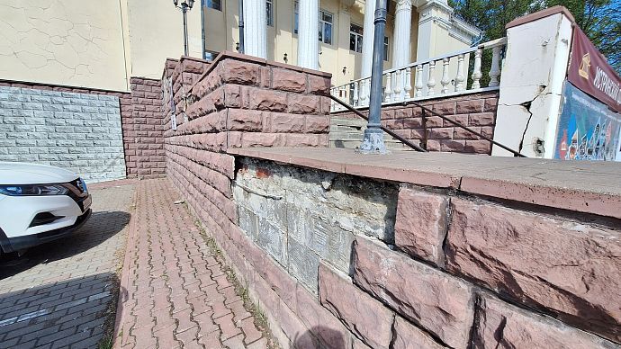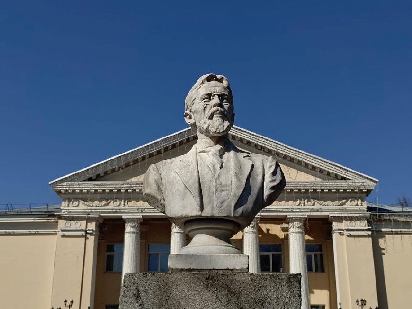 В Истре от мха и лишайника очистили бюст Чехова. Фасад ДК продолжает осыпаться