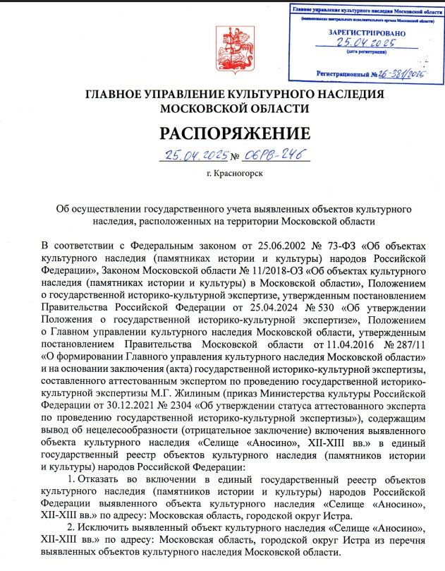 Он пришёл к выводу о нецелесообразности включения выявленного объекта культурного наследия в Единый государственный реестр объектов культурного наследия (памятников истории и культуры) народов Российской Федерации.