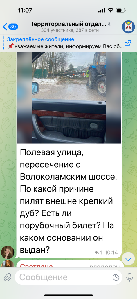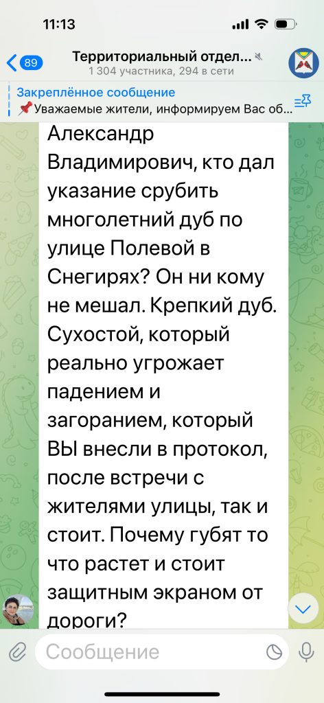 В ответ на вопрос жителей представители администрации в телеграм-канале ТО Снегири сослались на акт опиловки от отдела экологии, однако сам документ не предоставили, ссылаясь на закон о защите персональных данных.