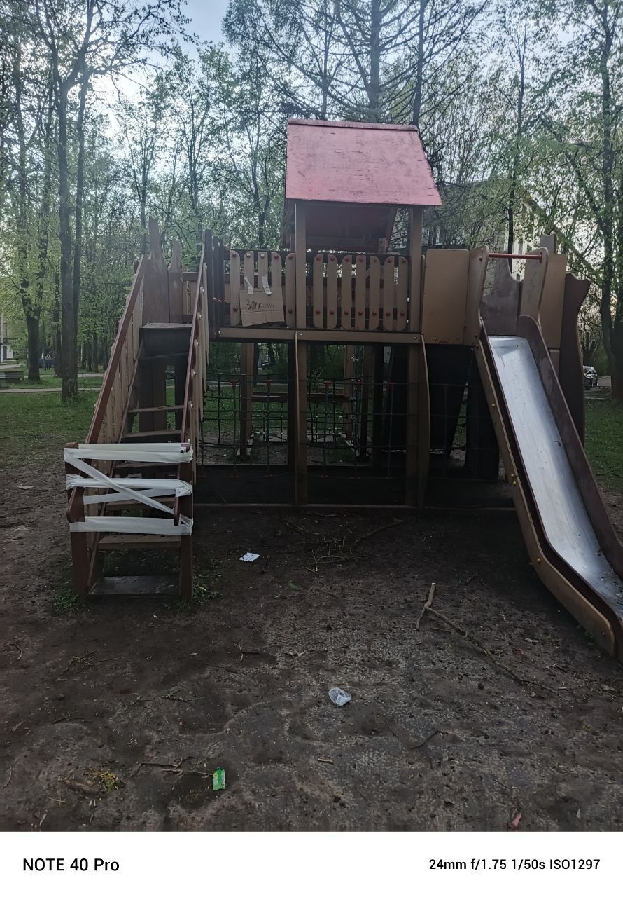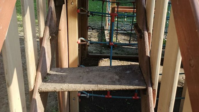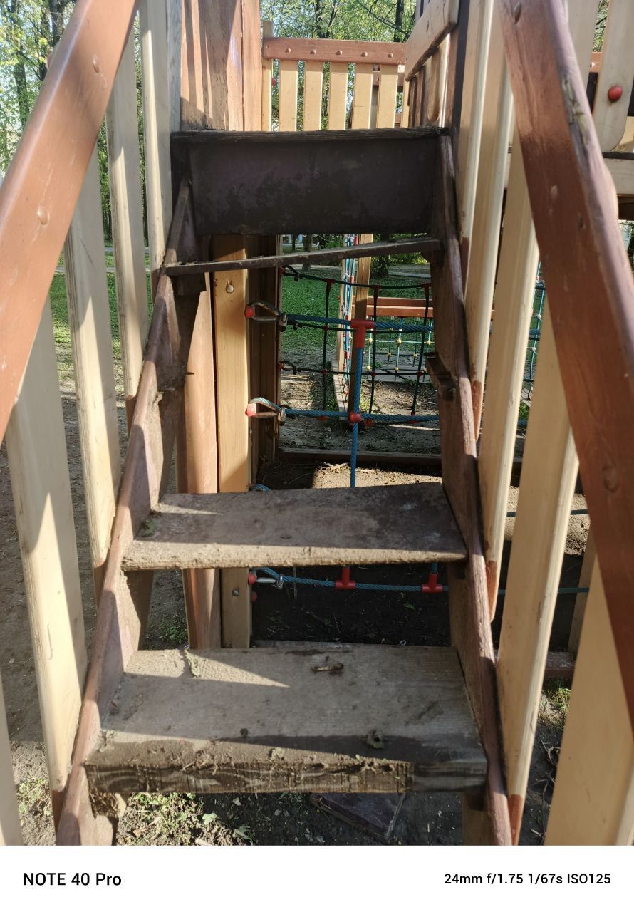 О том, что детская площадка представляет опасность, сообщили сами горожане. Дети могут получить серьёзную травму из-за рассыпающимися под ногами элементов игрового комплекса.