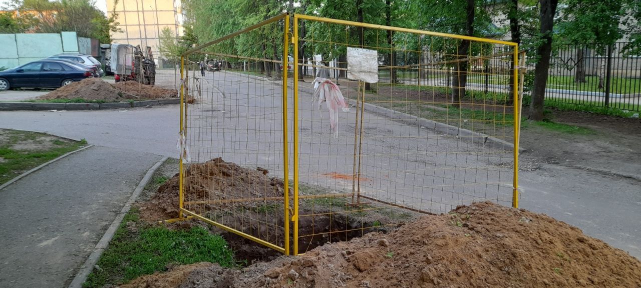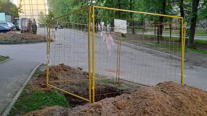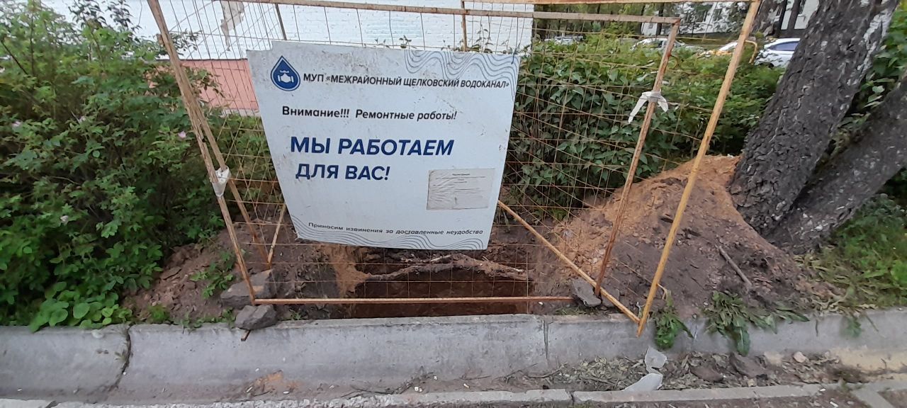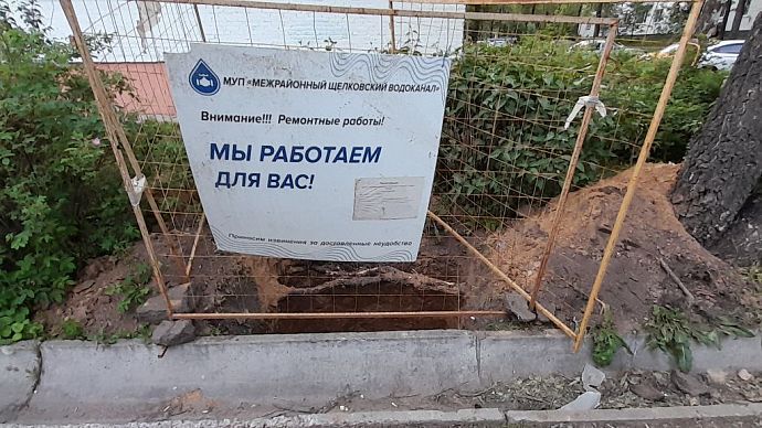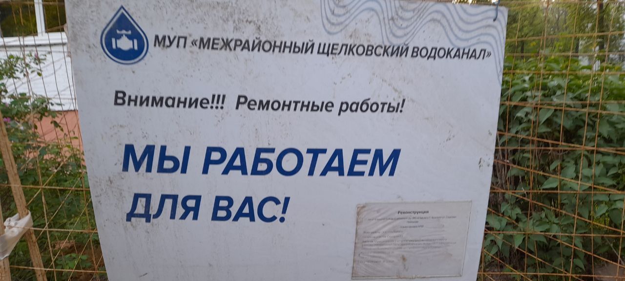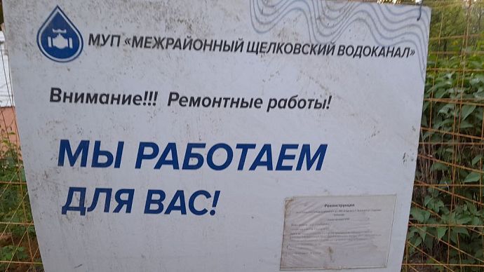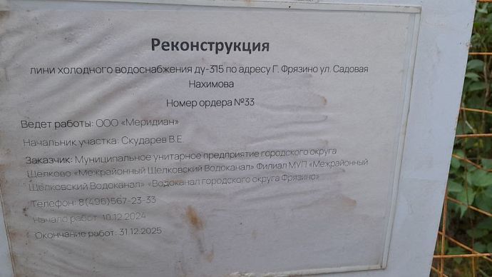 Щит уведомляет о реконструкции линии холодного водоснабжения в городе Фрязино.