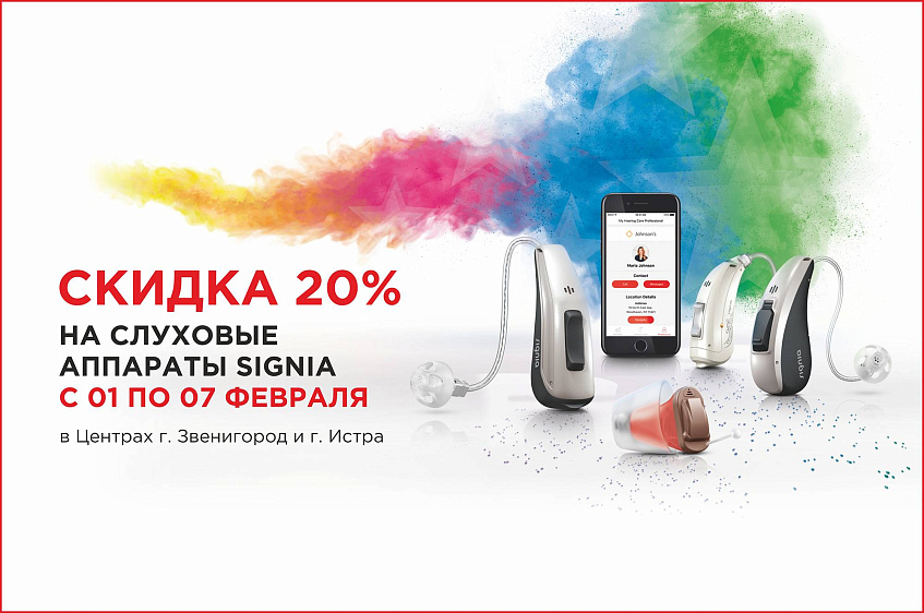 - воспользоваться скидкой 20% при покупке слуховых аппаратов Signia.