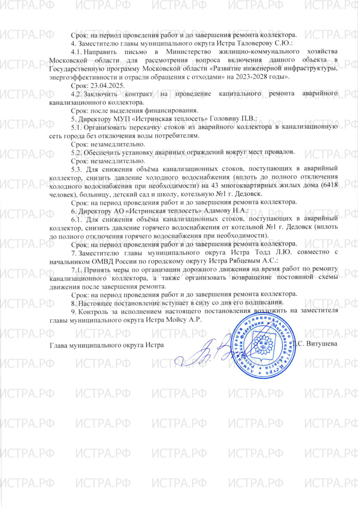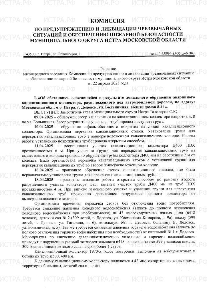 На следующий день, 10 апреля, произошло обрушение асфальтобетонного покрытия на линии канализационного коллектора. После этого была организована перекачка канализационных стоков и установлена груша для перекрытия стоков во втором колодце, расположенном выше.
