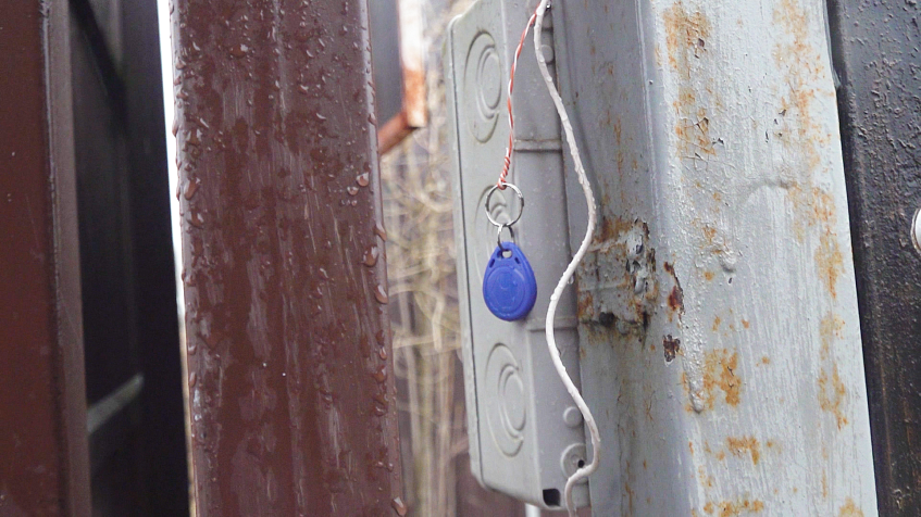 На воротах установлена кнопка для ручного открывания. Брелок повесили на верёвке. Чтобы воспользоваться им, человеку необходимо либо просунуть руку сквозь прутья ворот, либо пройти через калитку, подойти к кнопке, которая установлена только с внутренней стороны въезда, а затем вернуться в машину.