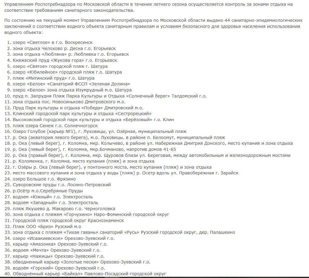 Городской пляж на улице Ленина в Истре не включён в перечень водных объектов, которые получили санитарно-эпидемиологическое заключение Роспотребнадзора о соответствии санитарным правилам и условиям безопасности для здоровья населения.