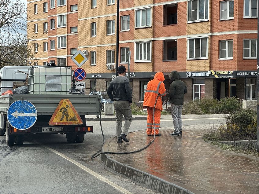 Накануне субботника в Истре моют тротуары