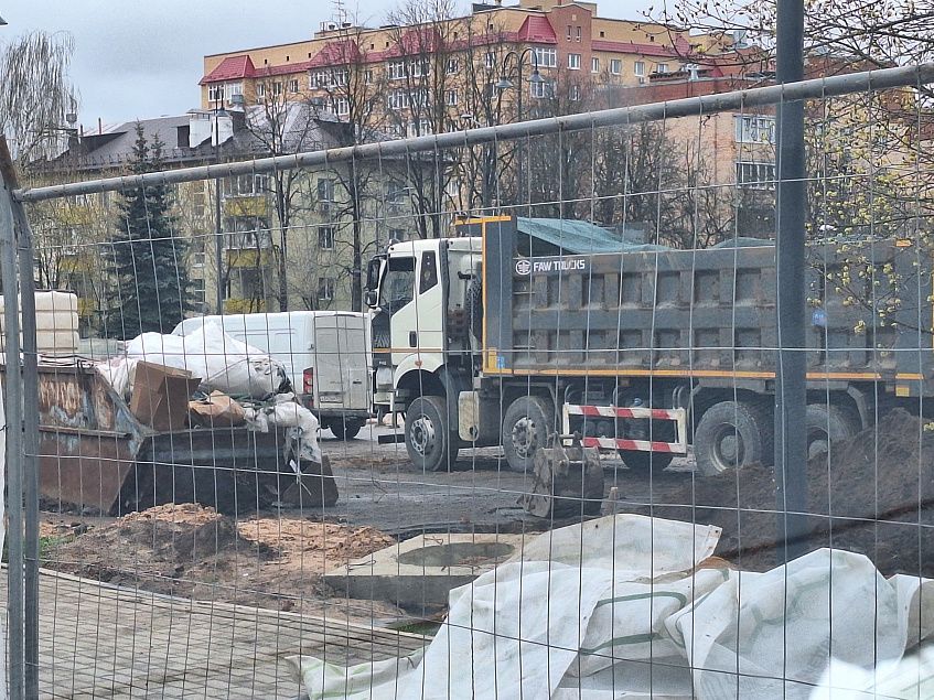 Техника в деле, специалисты на объекте: завозится плитка, идёт монтаж опор и прокладка освещения, установка бордюров и подготовка основания под пешеходные дорожки, — каждый этап в работе.