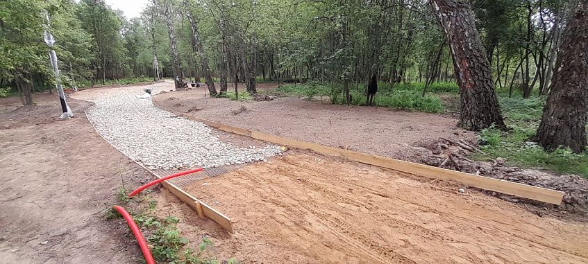 На сегодняшний день на объекте идут работы по обустройству дорожно-тропиночной сети, которая будет выполнена из гранитного отсева, также для организации подземной подводки уличного освещения роются траншеи для укладки кабеля, готовятся основания под функциональные зоны детских игровых и спортивных площадок.