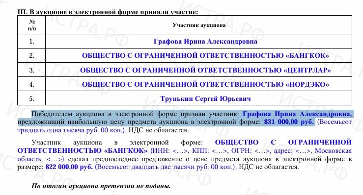 По данным протокола о результатах аукциона, который опубликован Комитетом по конкурентной политике региона, победителем аукциона в электронной форме признана Графова Ирина Александровна, предложившая наибольшую цену предмета аукциона в электронной форме — 831 000 руб. Напомним, начальная цена составляла 300 тысяч рублей.