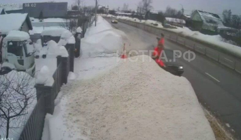 На камеру попал момент страшного ДТП. Водитель чёрного седана отвлёкся от дороги, и машина сбила двух коммунальщиков, находившихся на трассе. В это время они расчищали снег.