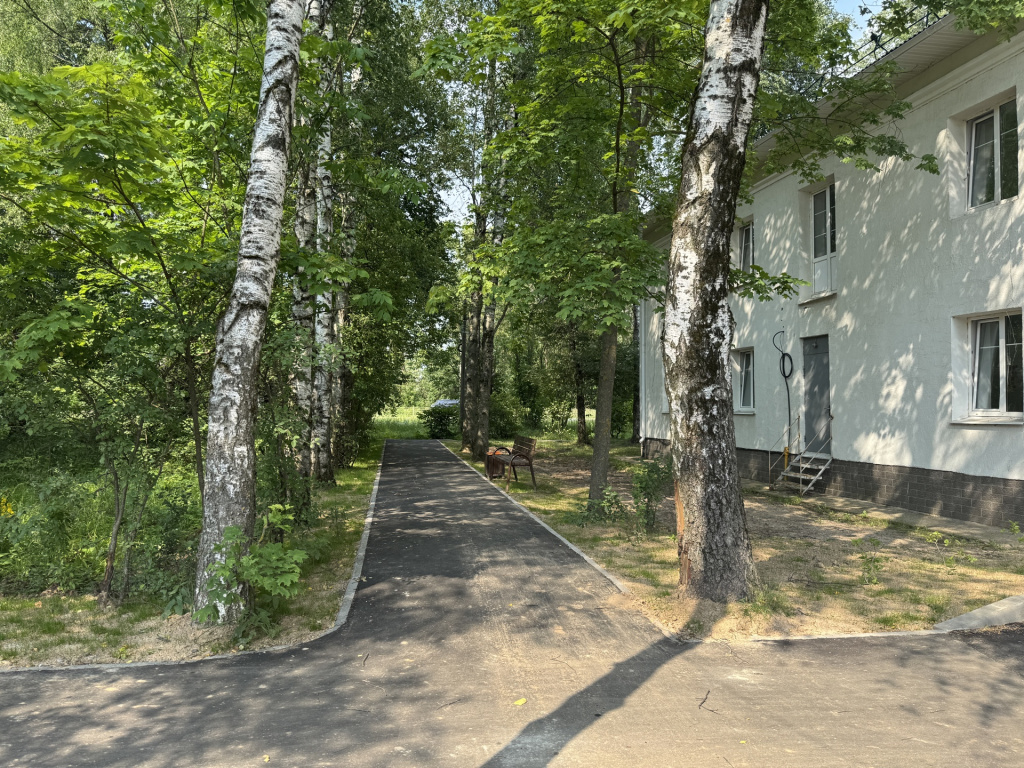 Хватило асфальта и для пешеходов: вокруг здания расширили и заасфальтировали дорожки. Здесь же установили лавочки и урны.