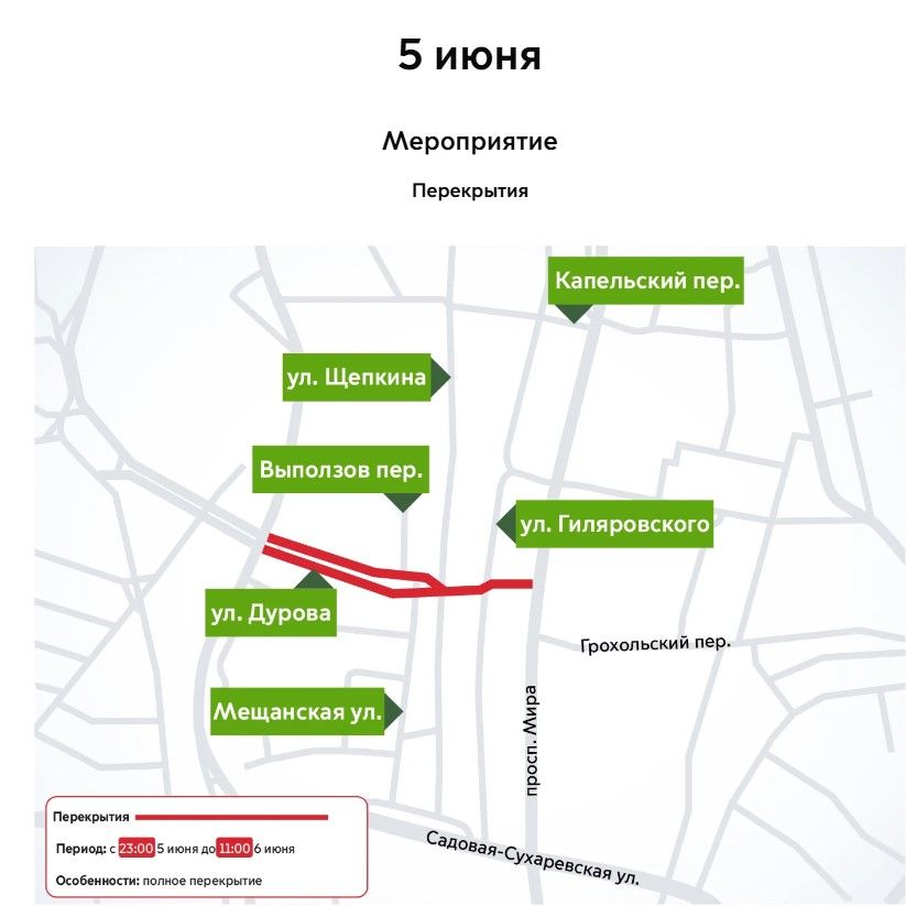 «5 и 6 июня в связи с проведением мероприятий временно будет закрыт ряд улиц в ЦАО, ЗАО и СВАО для движения транспорта», – говорится в сообщении.