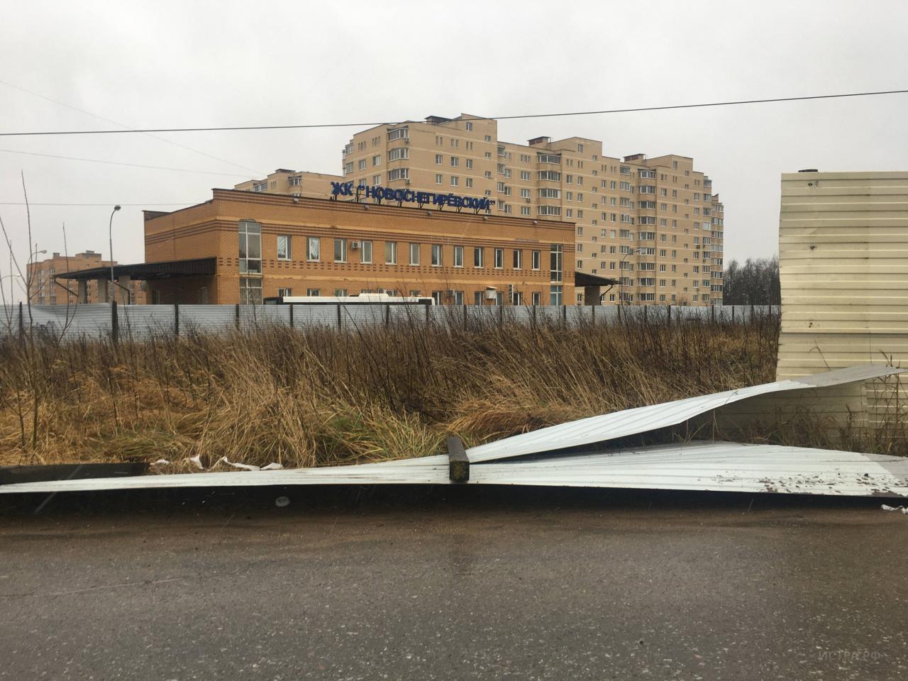 Непогода ещё только начинается, а в микрорайоне «Новые Снегири» уже сдуло ветром забор, окружающий территорию, на которой расположены многоквартирные дома. Металлические листы забора упали прямо на дорогу.