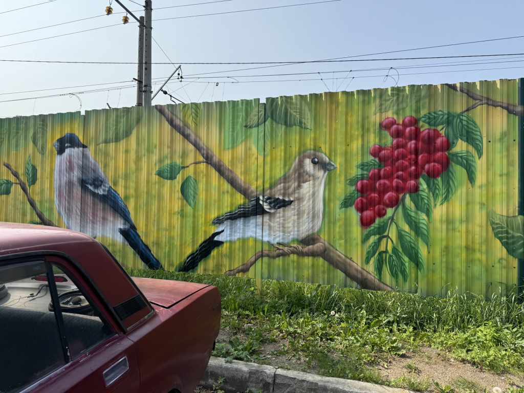 Граффити выполнили профессиональные художники. Внимание зрителей привлекает яркое оперение птиц и алые грозди рябины.